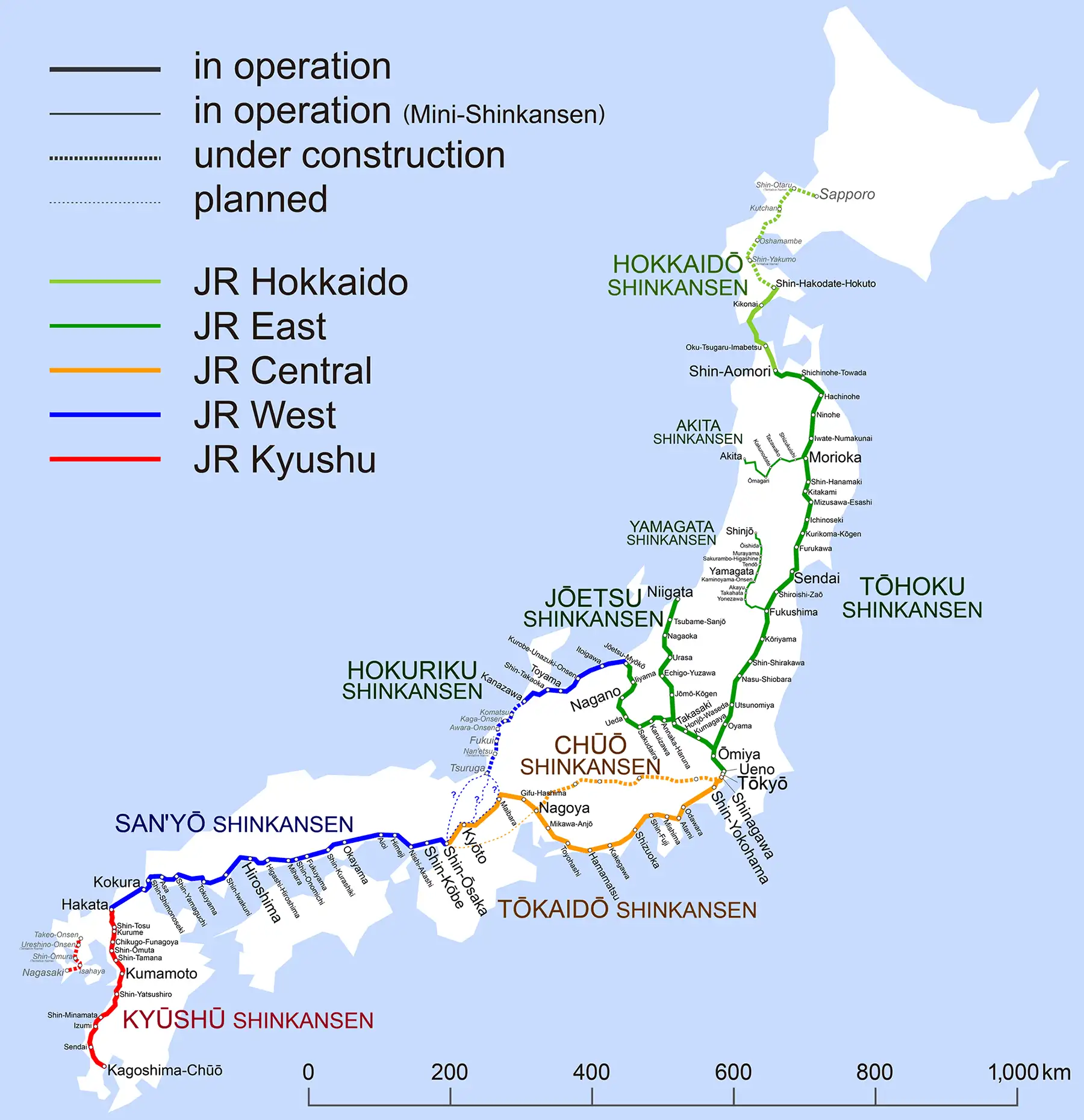Ad oltre cinquant’anni dall’apertura della Tokaido Shinkansen che ha trasportato sinora quasi 6.000.000.000 di passeggeri, 155.000.000 l’anno (IV link), il network veloce nipponico è tuttora in espansione sebbene abbia raggiunto i 2.612 km d’estensione (come definito nella tabella sottostante) ed è ancora considerato un modello di sviluppo da perseguire, nonostante la grave crisi economica, l’invecchiamento della popolazione ed il decremento dal punto di vista demografico dovuto al basso tasso di natalità, elementi che non favoriscono lo sviluppo delle reti infrastrutturali.