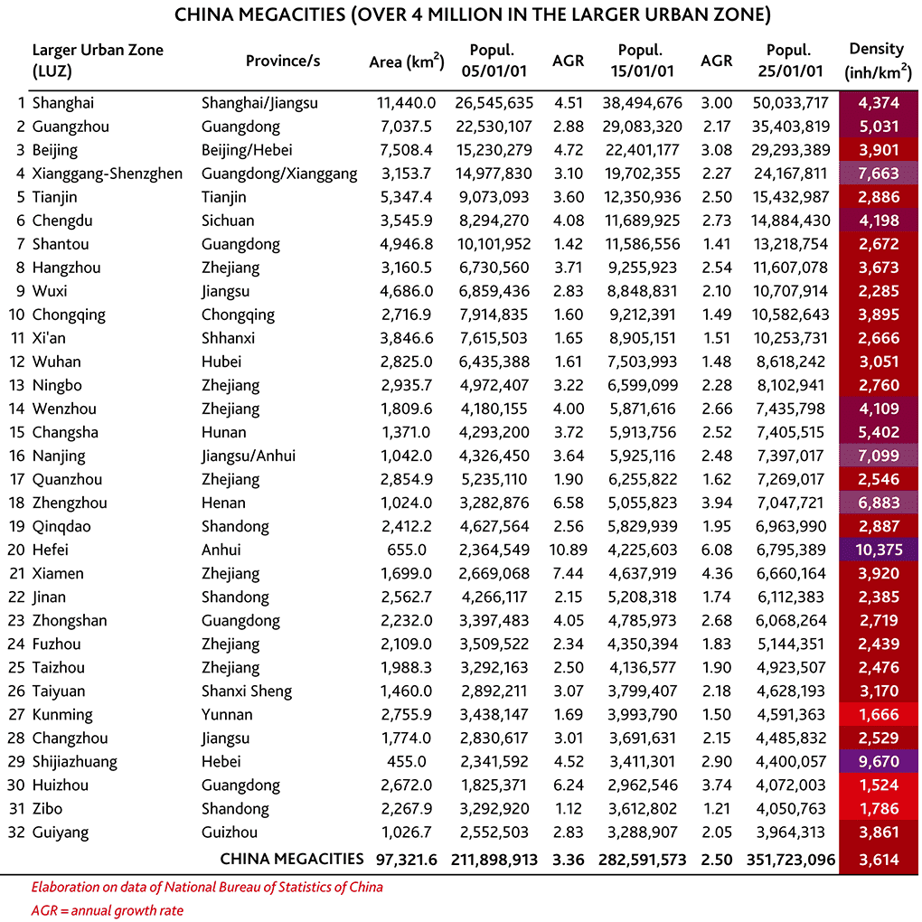La popolazione complessiva delle aree urbane con oltre 4 milioni di abitanti era 211,8 milioni nel 2010 (15,8% del totale del Paese); nel 2015 era di 282,6 milioni (20,4%); nel 2025 sarà di 351,7 milioni pari al 26% rispetto ad una popolazione nazionale stabilizzato intorno ai 1.342 milioni di persone: un aumento della popolazione delle grandi città pari a 140 milioni di persone pari a quasi il 70% in 15 anni.