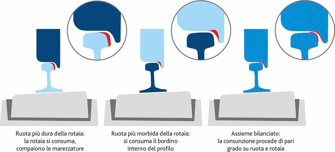 - Con una conseguente progettazione ad hoc, del complesso ruota/rotaia inclusa la scelta delle rispettive durezze in rapporto alle sezioni di linea che risultano più sollecitate durante la marcia