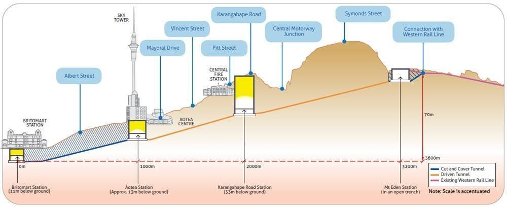 Nasce così il City Rail Link (CRL), il progetto per la realizzazione di un tunnel ferroviario di 3.490 metri a 42 metri sotto il centro della città. Il passante sfioccherà dal fascio ferroviario in accesso a Britomart, passando per Albert, Vincent e Pitt Streets, quindi attraverserà Karangahape Road e gli svincoli della Central Motorway Junction verso Symonds Street prima di congiungersi alla western line ad Eden Terrace.