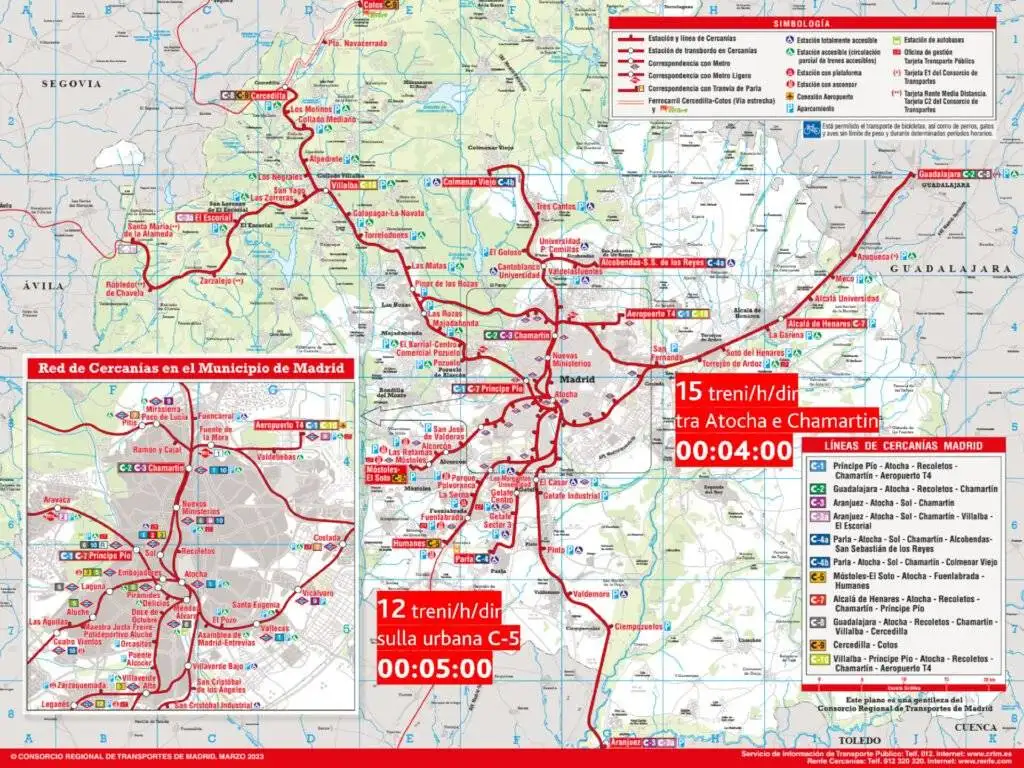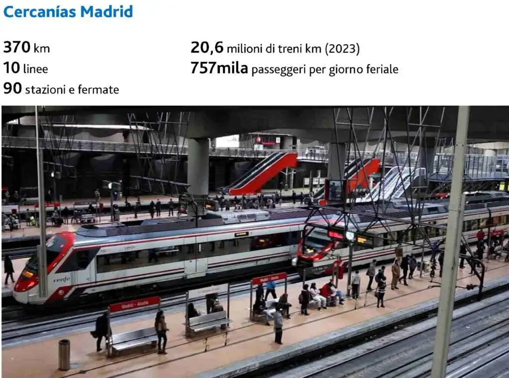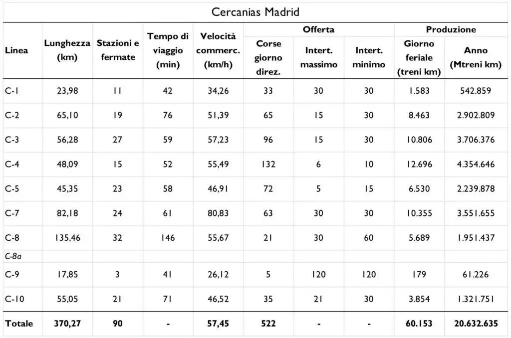 La rete delle ferrovie vicinali di Madrid conta 10 linee su 370 km di impianti ferroviari con 90 tra stazioni e fermate. Con una produzione (2023) di poco meno di 21 milioni di treni km anno la domanda è di 757mila passeggeri per giorno feriale. Il passante centrale Atocha – Nuevos Ministerios – Chamartin conta 15 treni/h/dir con un intertempo cumulato di 4,0’ per direzione. La linea più frequente è la C-5 Hermanes – Móstoles, una ferrovia urbana separata dai traffici di media e lunga percorrenza, di 45,3 km e 23 fermate con 12 treni/h/dir e un intertempo di 5’.