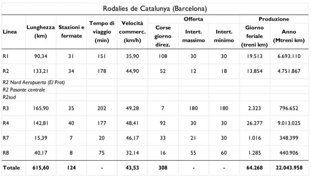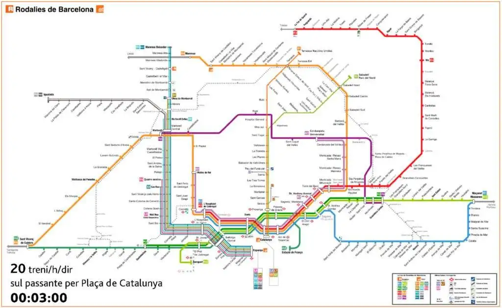 La rete delle ferrovie vicinali di Barcellona – quella esercita dal gestore nazionale Renfe – conta 6 linee su 463 km di impianti ferroviari con 124 tra stazioni e fermate. Con una produzione (2023) di 22 milioni di treni km anno la domanda è di 384mila passeggeri per giorno feriale. Sul passante di Plaça de Catalunya transitano 20 treni/h/dir con un intertempo cumulato di 3,0’.