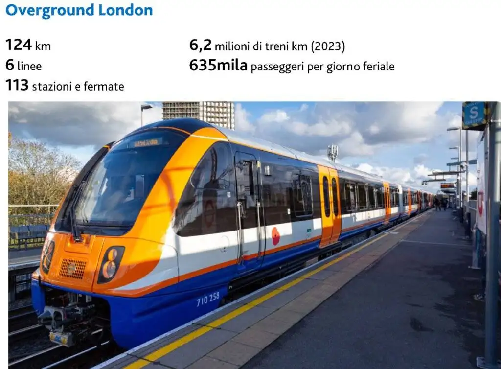 Overground è un servizio di recente attivazione nell’est londinese, parte dell’ampio e articolato sistema ferroviario che converge sulla capitale britannica. 6 linee su 124 km di impianti ferroviari con 113 tra stazioni e fermate. Con una produzione (2023) di 6,2 milioni di treni km anno la domanda è di 635mila passeggeri per giorno feriale.