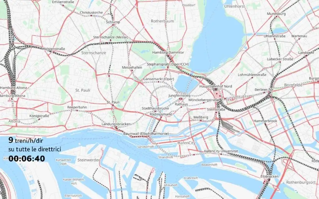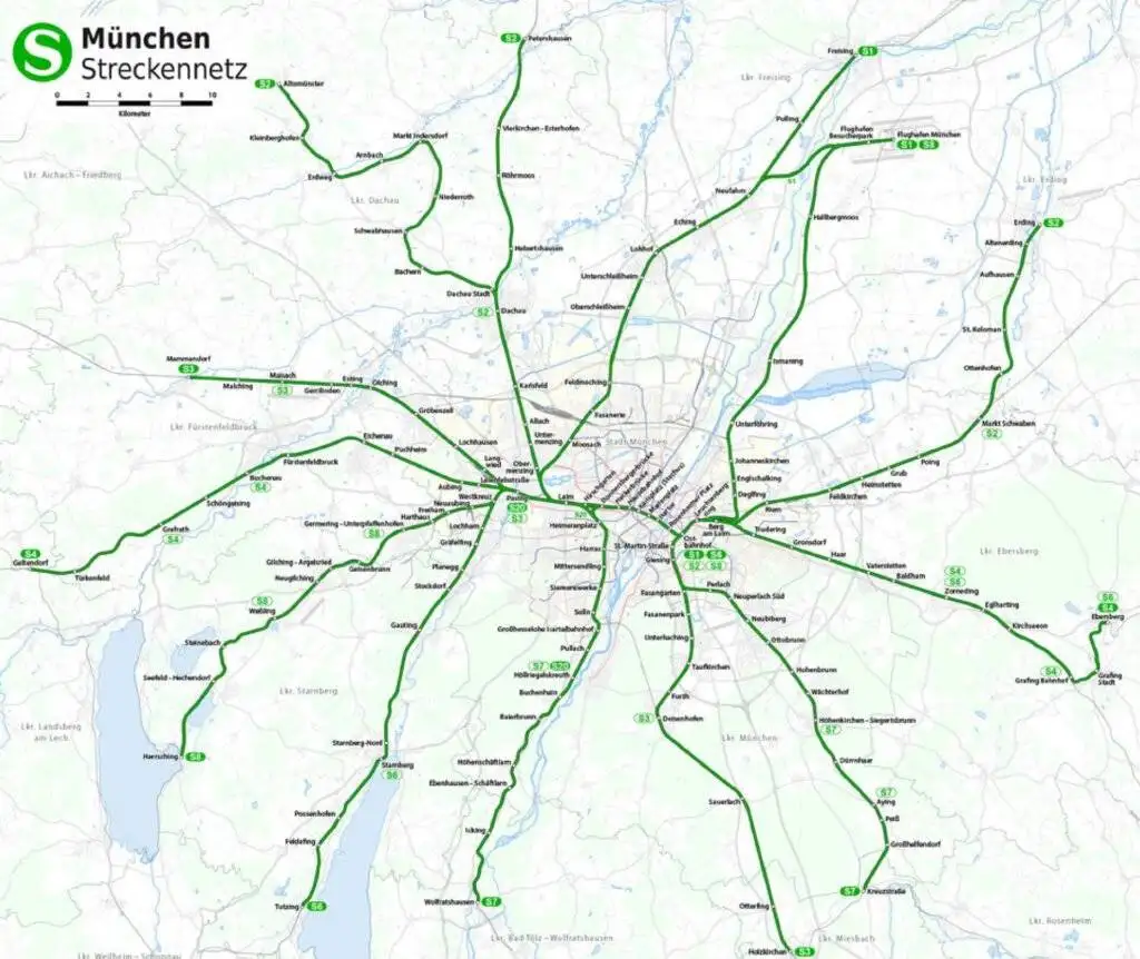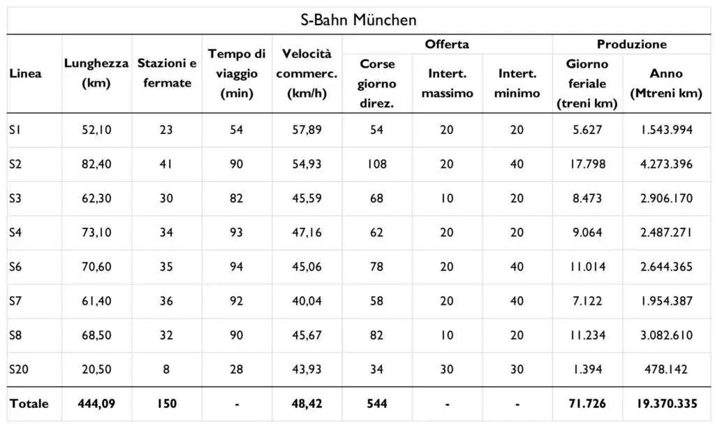 La rete della capitale bavarese con 6 direttrici occidentali e 6 direttrici orientali che transitano sul passante centrale dove si hanno 29 treni/h/dir e un intertempo di 2’ 01’’. 8 linee su 444 km di impianti ferroviari con 150 tra stazioni e fermate. Con una produzione (2023) di 19,4 milioni di treni km anno la domanda è di 1,1 milioni di passeggeri per giorno feriale.