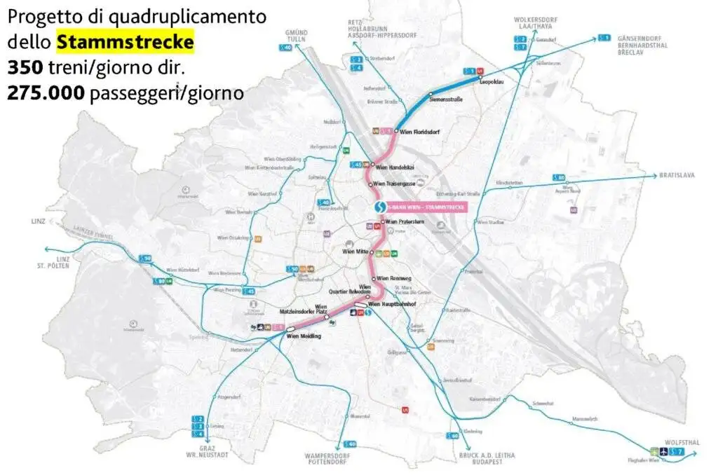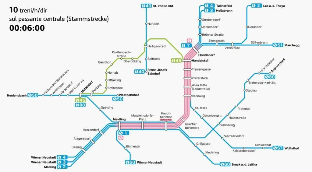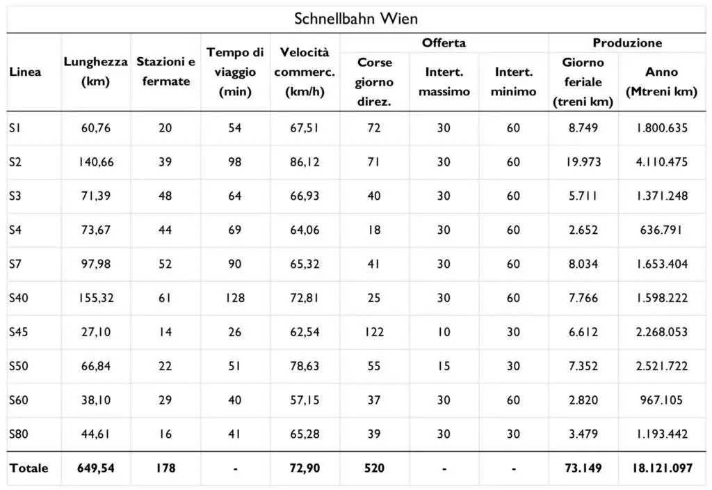 La rete celere della capitale austriaca conta 10 linee su 649 km di impianti ferroviari con 178 tra stazioni e fermate. Con una produzione (2023) di poco meno di 18,1 milioni di treni km anno la domanda è di 380mila passeggeri per giorno feriale.