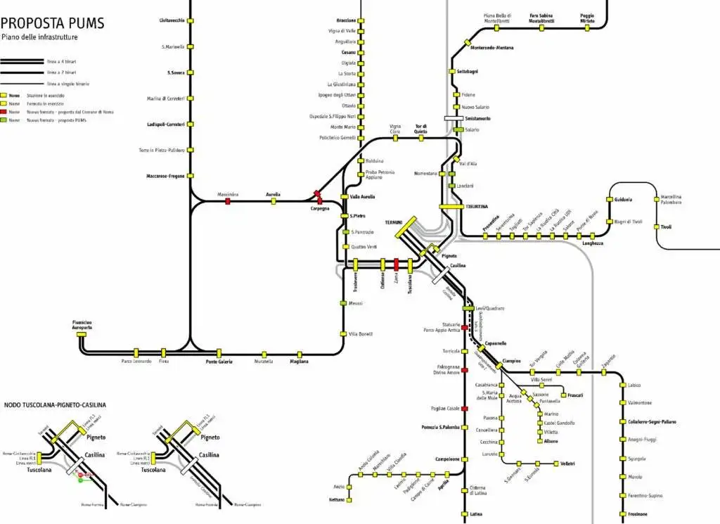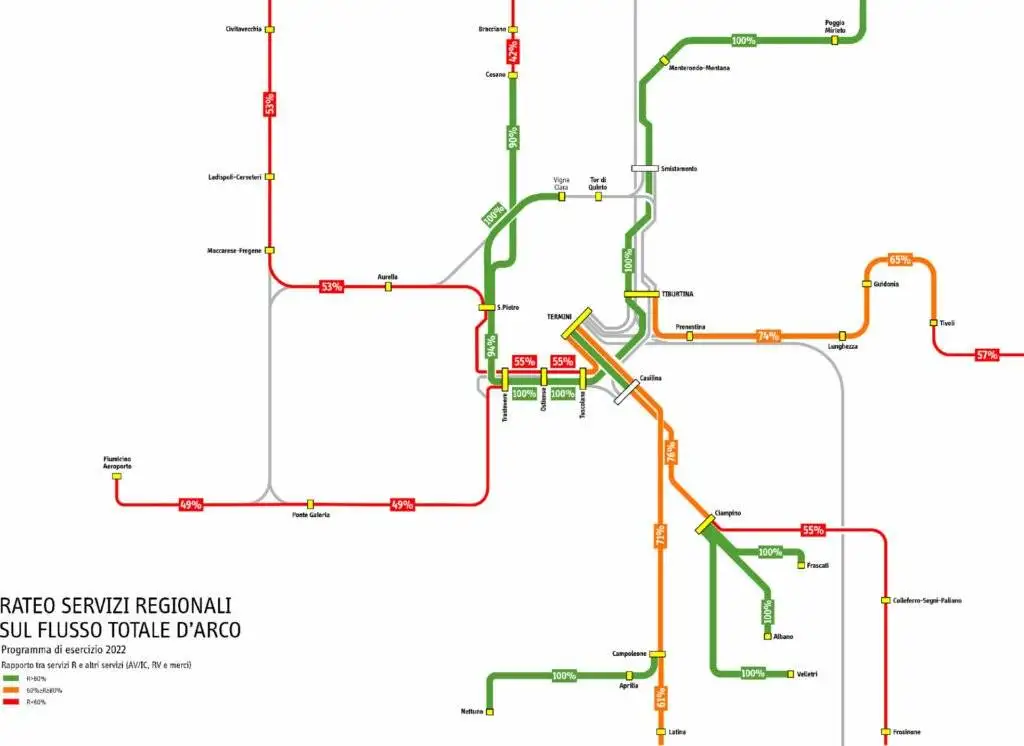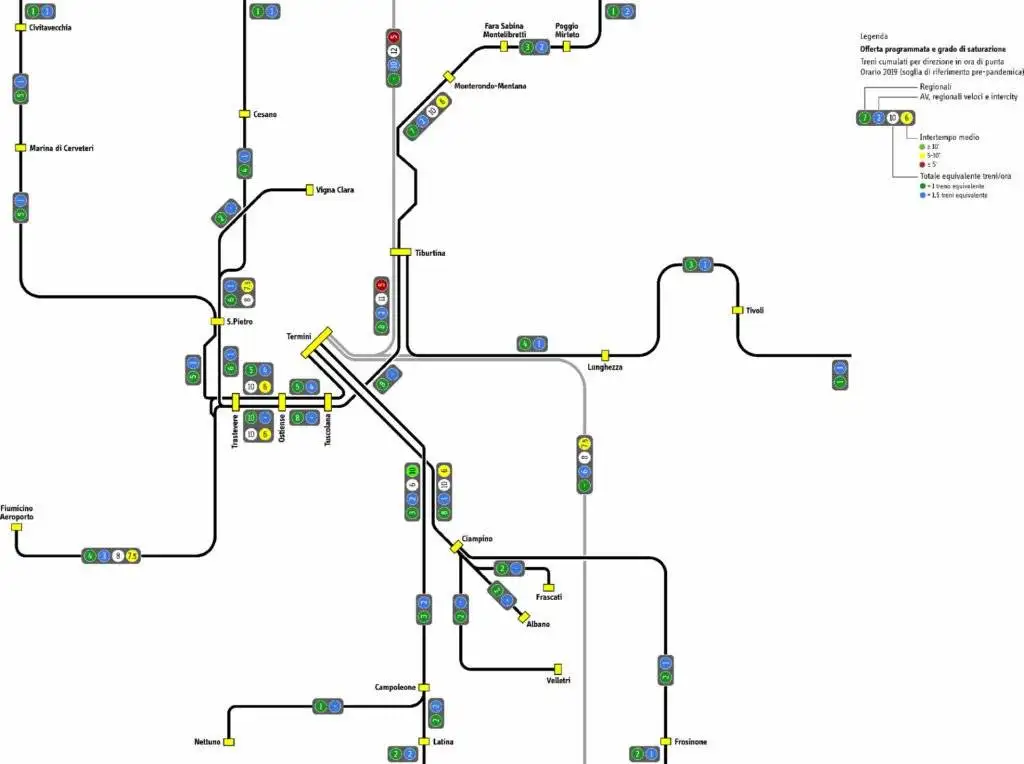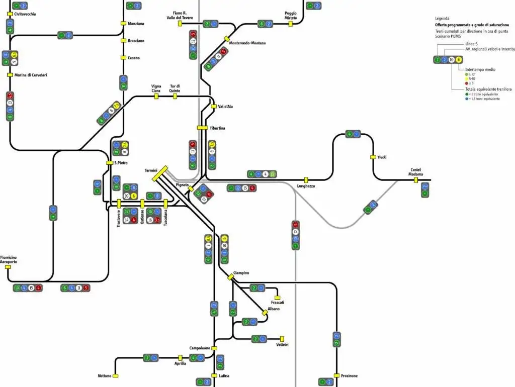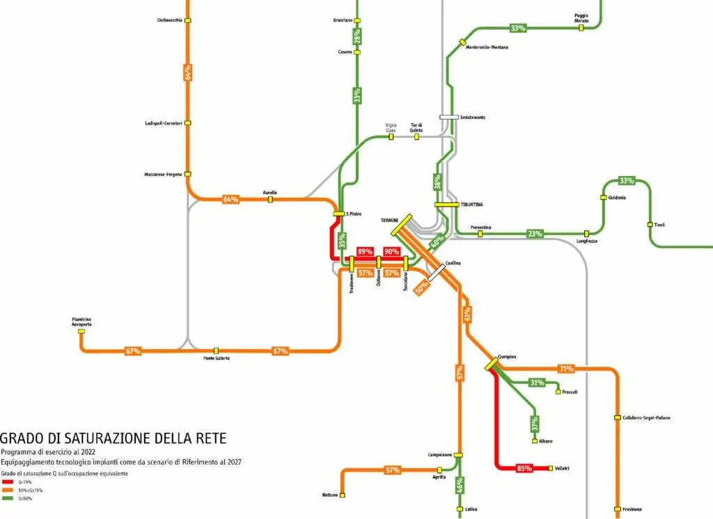 2. l’assenza di posti di movimento sulle tratte più recenti (ramo San Pietro-Cesano e Prenestina-Lunghezza) per la gestione delle precedenze dei servizi di media e lunga percorrenza rispetto a quelli metropolitani e suburbani.