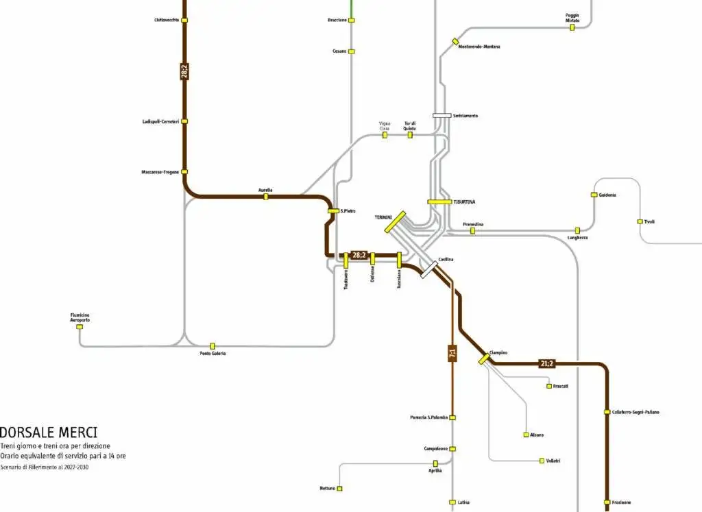 Il passo successivo è quello di catalogare i servizi in accesso al nodo per categoria, a iniziare da quelli che utilizza-no la stessa infrastruttura dei servizi regionali cioè, escludendo i servizi ad Alta Velocità che utilizzano prevalentemente un’infrastruttura separata, quelli del traffico merci. L’itinerario principale che interessa la Città metropolitana è costituito dalla linea Tirrenica, dalla cintura Sud ramo Tuscolana-San Pietro, dal raccordo Tuscolana-Casilina e dalla linea Casilina-Cassino-Napoli. Su questa dorsale il carico di progetto è di due treni ora per direzione ovvero 21 treni giorno per direzione su un orario nominale di esercizio di 14 ore. La Casilina-Pomezia Santa Palomba è una direttrice secondaria interessata al solo servizio della locale zona industriale con un carico nominale del 50% della dorsale principale: oltre la linea Roma-Formia-Napoli non è abilitabile (a meno di importanti opere di adeguamento delle gallerie (Vivola 7,45 km, Monte Orso 7,53 km e Monte Massico 5,38, interventi che secondo RFI non sarebbero economicamente giustificati dai volumi di traffico attesi) al transito merci ai sensi della Direttiva (UE) 2016/797 relativa all’interoperabilità del sistema ferroviario dell’Unione Europea. La definizione di questa dorsale merci rende non più necessaria né economicamente sostenibile la realizzazione della cosiddetta Gronda Sud di collegamento tra la linea Tirrenica e la Roma-Formia in quanto non andrebbe a costituire un itinerario utile al collegamento con la linea Roma-Cassino.