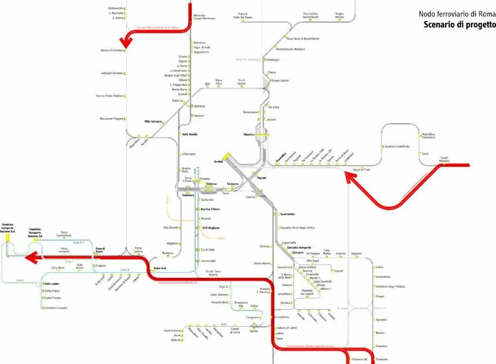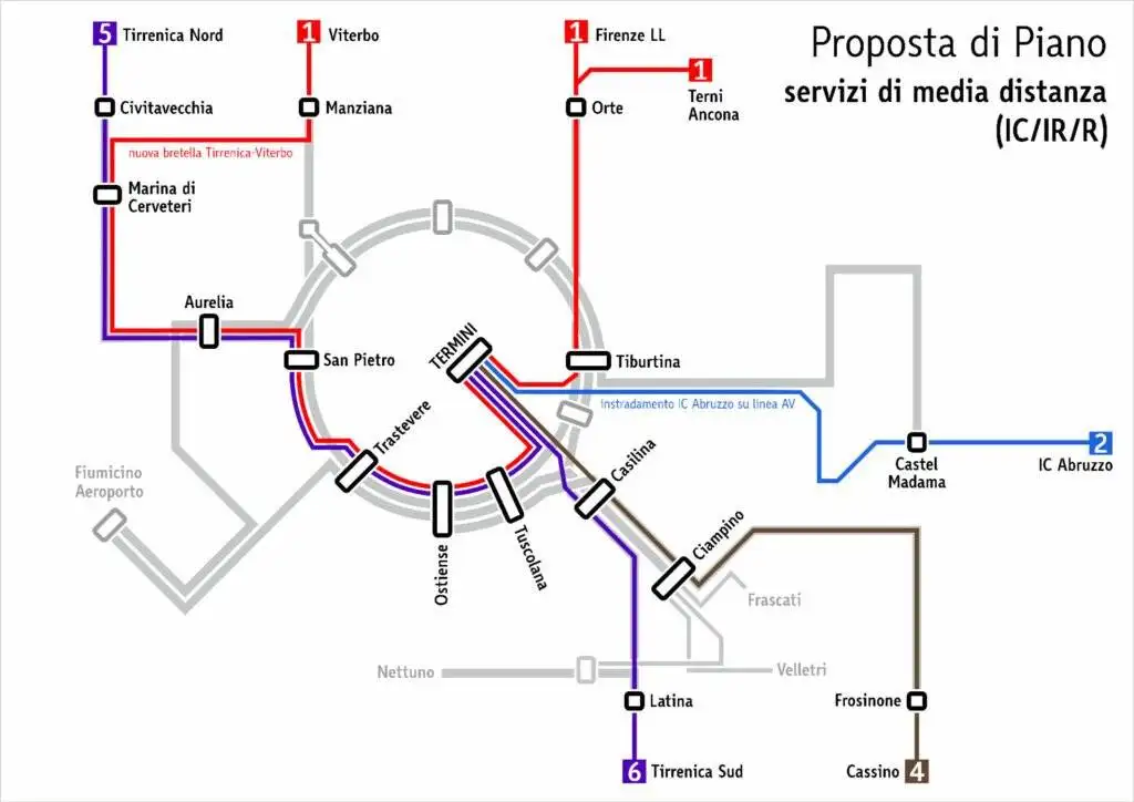 2. Realizzazione di un by-pass (circa 18 km) tra la ferrovia Roma-Capranica-Viterbo e la ferrovia Roma-Grosseto per instradare su questa i servizi regionali da Viterbo. In questo modo: (a) si riduce il tempo di percorrenza tra Viterbo e Roma Termini dalle attuali 3:09 a 1:40 con una riduzione di 90 minuti circa; (b) si dedica la tratta ferroviaria tra Manziana e Ostiense al solo esercizio delle linee S, spostando i regionali sulla linea Roma-Grosseto. Anche all’interno del nodo la coppia di binari Termini-Ostiense afferenti alla Roma-Grosseto resta dedicata al solo servizio regionali e ai treni veloci del Leonardo Express per Fiumicino Aeroporto.