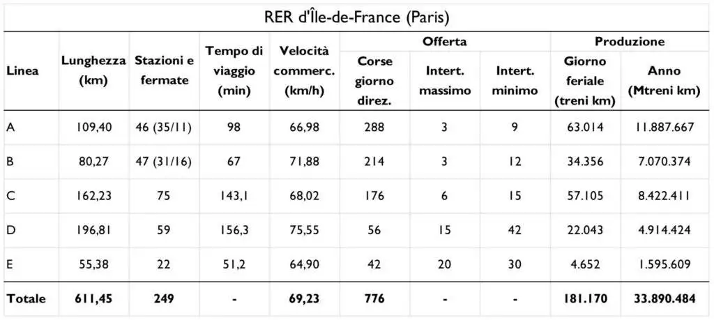 La Rete Espressa Regionale dell’Île-de-France è la regina delle reti ferroviarie metropolitane in Europa la terza più frequentate al mondo dopo Tokyo e Seul. 5 linee su 612 km di impianti ferroviari con 249 tra stazioni e fermate. Con una produzione (2023) di poco meno di poco meno di 34 milioni di treni km anno la domanda è di quasi 3 milioni di passeggeri per giorno feriale. Le tratte centrali delle linee A e B sono completamente separate dal resto della rete ferroviaria: la gestione è congiunta tra RATP, il gestore del trasporto pubblico parigino e SNCF, il gestore ferroviario nazionale francese.