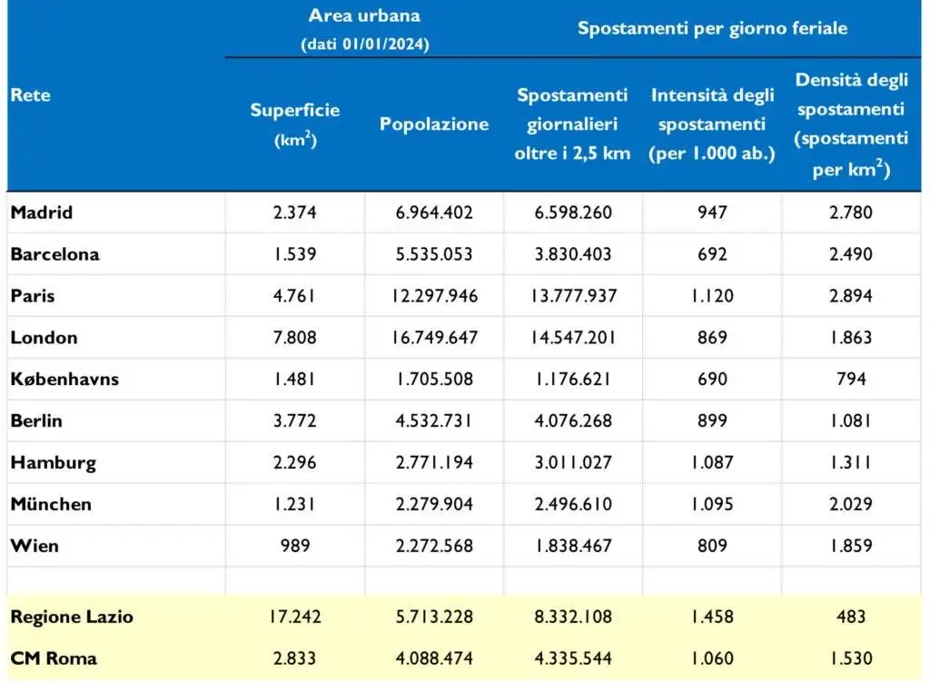 Il rateo modale degli spostamenti in treno sul totale degli spostamenti oltre i 2,5 km è intorno al 10% per Roma come Madrid e Barcellona – dove però il 40% degli spostamenti si svolge in metropolitana, anche questa quota a Roma è ferma al 10% – mentre per le altre reti oscilla tra il 25% e il 40%.