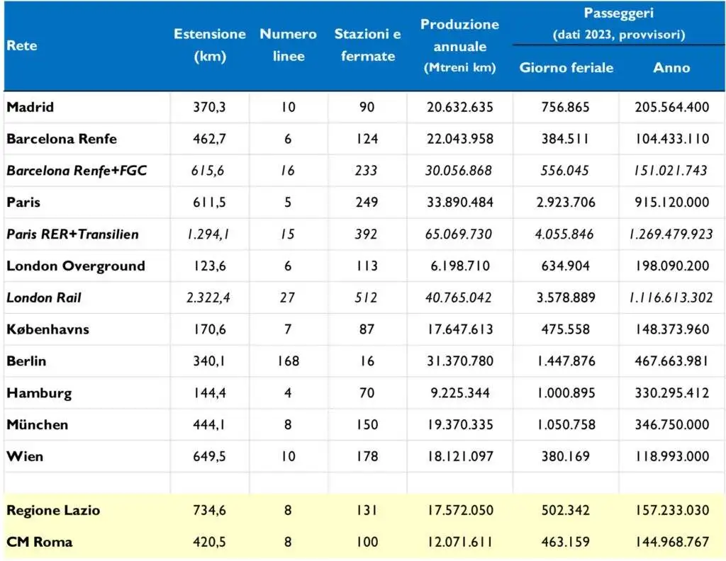 Le 9 reti europee esaminate permettono un interessante confronto delle performance del servizio ferroviario capitolino: oggi, non esistendo un vero e proprio servizio cadenzato, non è semplice isolare i dati del servizio ferroviario suburbano della Città metropolitana di Roma. Pertanto, nelle tabelle seguenti è inserita sia la produzione dell’intero servizio ferroviario regionale del Lazio (linee FL) che quello tagliato alla sola Città metropolitana di Roma (ovvero la ex provincia).