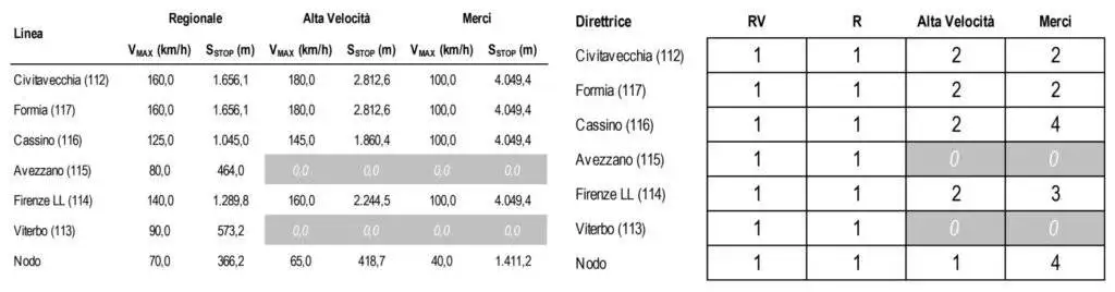 Per comprendere a pieno le funzionalità e le reali capacità del nodo ferroviario con l’alta densità è importante fare un richiamo sulle regole di distanziamento dei treni e sui relativi spazi di frenata. Da queste caratteristiche deriva l’impronta di un singolo treno sulla tratta ovvero il numero di tracce sul massimo nominale disponibile che sul nodo di Roma è di un intertempo di 3’/20 tracce ora direzione disponibile ove presente l’ERTMS HD e 5’/12 tracce ora direzione sul resto delle tratte a doppio binario. Sulle tratte a binario singolo come la Lunghezza-Sulmona, le linee Ciampino-Castelli e la Campoleone-Nettuno il numero di tracce orarie disponibili è dato dalla distanza massima tra due stazioni a doppio binario ove gestire l’eventuale incrocio tra treni procedenti in dire-zione diversa nominalmente senza imporre tempi di attese aggiuntivi.