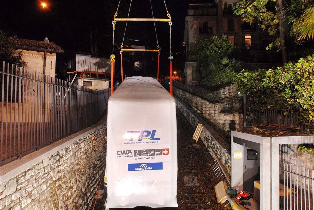 N ella prima mattina del 10 ottobre sono giunte a Lugano le due carrozze della nuova funicolare di Lugano con un trasporto eccezionale proveniente dalla Svizzera tedesca. I due grossi camion si sono posizionati presso la Cattedrale di San Lorenzo in prossimità del raddoppio centrale dei binari e con una autogru i due veicoli sono stati calati per la prima volta sui binari e ancorati al nuovo cavo di traino. I veicoli sono stati costruiti dalla svizzera CWA, azienda di Olten specializzata in impianti a fune sia in ambito montano che urbano. Nei prossimi giorni inizieranno i test e i collaudi per arrivare preparati all’11 dicembre, giorno dell’inaugurazione.