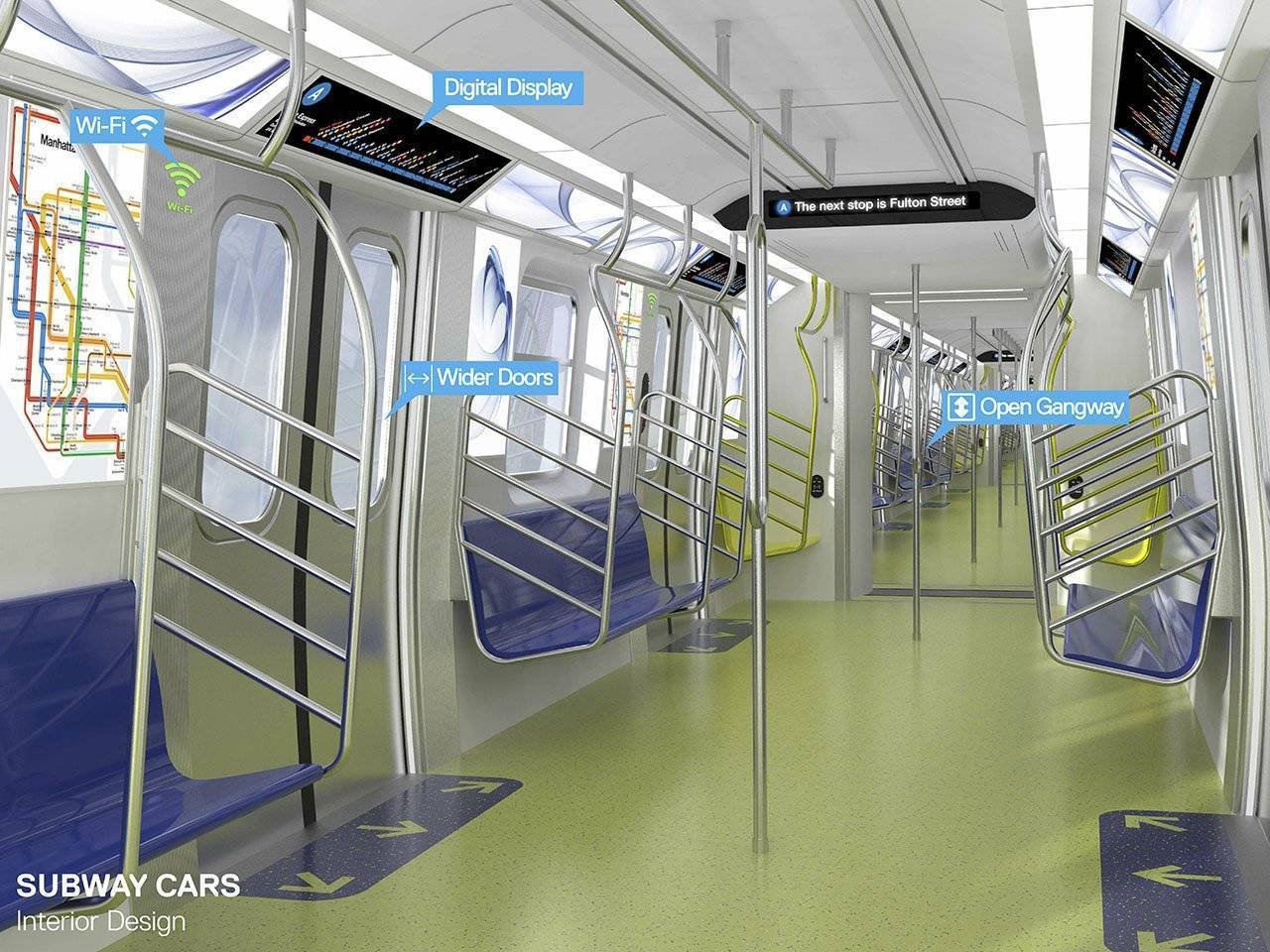 Altra importante miglioria riguarderà le porte che saranno più larghe per permettere un migliore e più veloce movimento di imbarco/sbarco, si stimano 1/3 di minori attese. Per il resto verranno usate le altrettanto standard luci al led e display LCD per le informazioni oltre al Wi-Fi, tutte “prime visioni” a New York. I treni avranno anche finestrini più grandi e la livrea avrà un frontale blu con striscia che scorre lungo la fiancata e indicatore di linea digitale a colori. Il frontale ci ricorda vagamente quello dei nuovi treni della underground londinese.