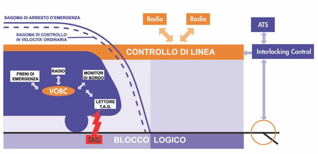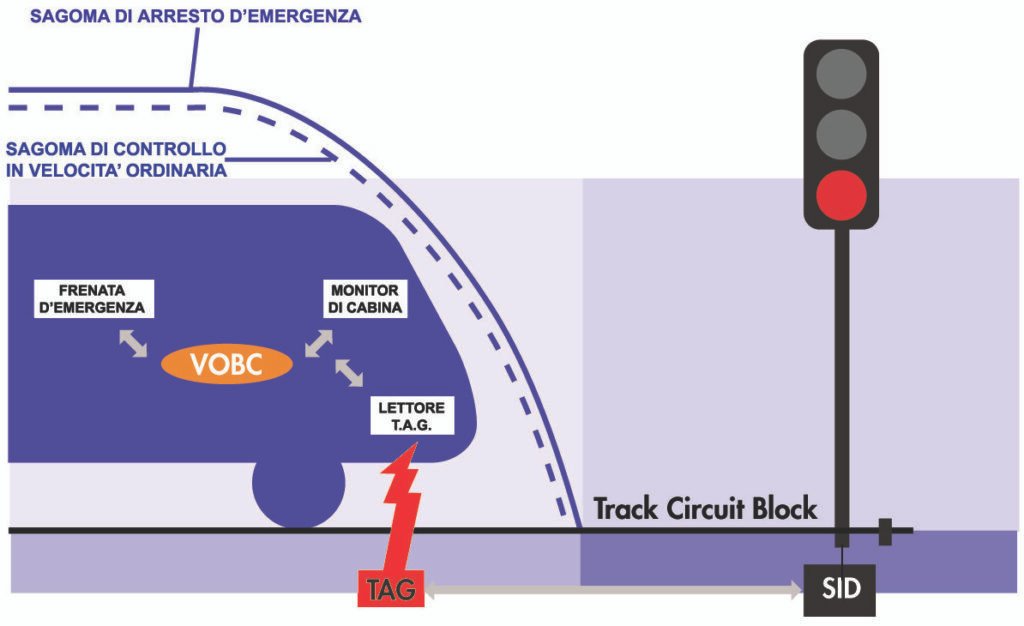 • il Sotto-Sistema di Bordo (SSB) elabora questi dati e aiuta il macchinista a rispettare segnali, velocità massime e rallentamenti, con funzioni di controllo della velocità e, nelle configurazioni più recenti, possibile intervento sui freni;