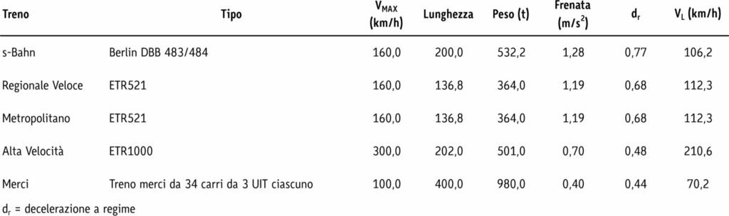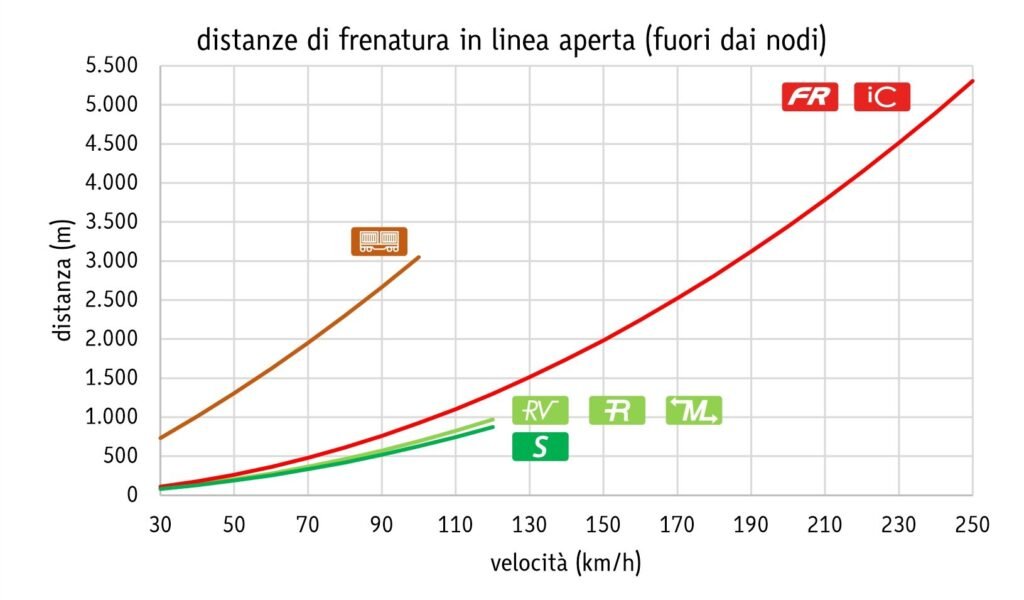 Distanze di frenatura per diversi tipi di treni in linea aperta (fuori dai centri urbani/nodi)