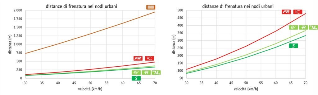 Distanze di frenatura per diversi tipi di treni nelle tratte di nodo urbano. A destra dettaglio, esclusi i treni merci