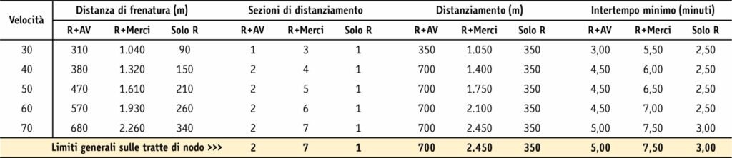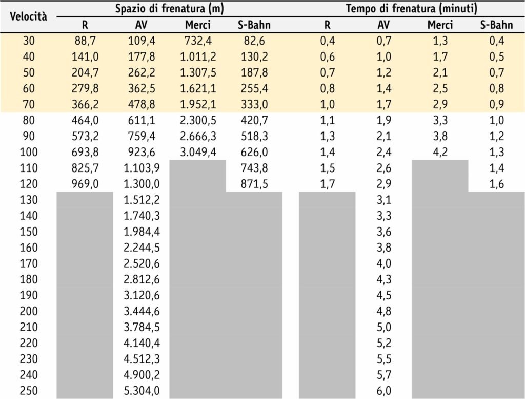 Sintesi delle caratteristiche dinamiche di frenatura (tempi/distanze) per diversi tipi di treni: in giallino le velocità ammissibili in nodo urbano